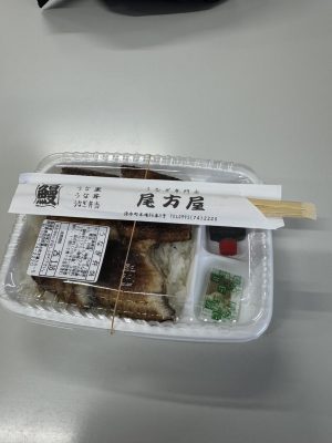 お昼はうなぎ専門店尾方屋の弁当をいただきました。うなぎはふんわり柔らかく